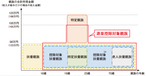 今回の改正では、令和8年分以降の扶養控除等申告書に記載する対象者が「源泉控除対象親族」と定義されました。この範囲には、これまでの控除対象扶養親族(合計所得58万円以下)に加え、19歳以上23歳未満の特定親族のうち、合計所得が58万円を超えて100万円以下の子どもも含まれます。つまり、所得100万円が新たな分岐点となります。